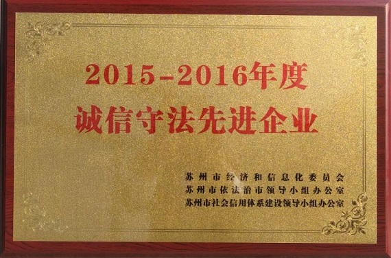 2018年4月24日,開信精工獲得由蘇州市經濟和信息化委員會、蘇州市依法治市領導小組辦公室、蘇州市社會信用體系建設領導小組聯(lián)合頒發(fā)的“誠信守法先進企業(yè)”銅牌。